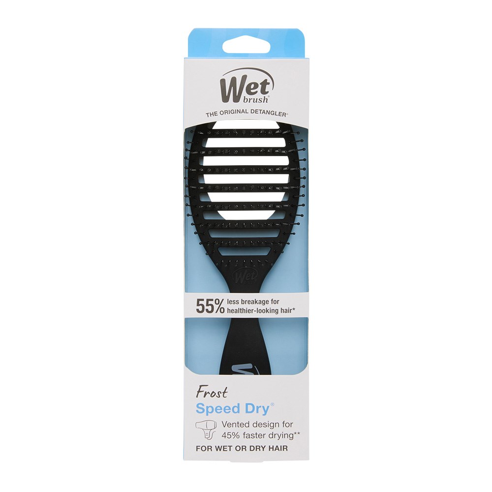 Meet the WetBrush Frost Speed Dry Black. Dry hair without drying it out. The Speed Dry’s vented design speeds up drying time by allowing moisture to escape faster. Heat-resistant HeatFlex bristles gently detangle while blow-drying. Skip the extra heat and avoid damage, helping to keep hair happier. Brush design contours to scalp for extra comfort.