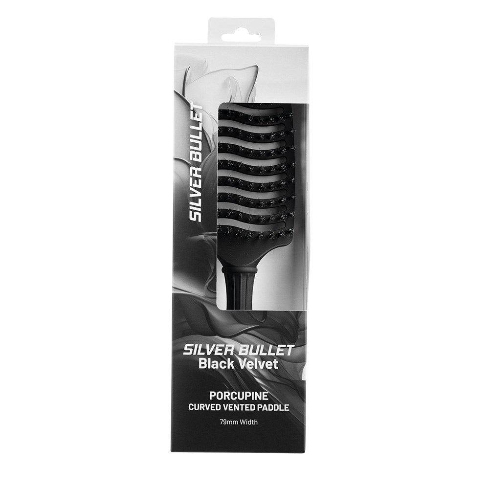 Want to style hair as smooth and soft as velvet? Silver Bullet Black Velvet Curved Vent Porcupine Paddle Hair Brush is ideal for detangling, smoothing and drying. The vented design speeds up blow-drying to boost your efficiency, while the curved head contours to your scalp for superior comfort. The durable nylon and boar bristles give you luxurious results with impeccable ease.