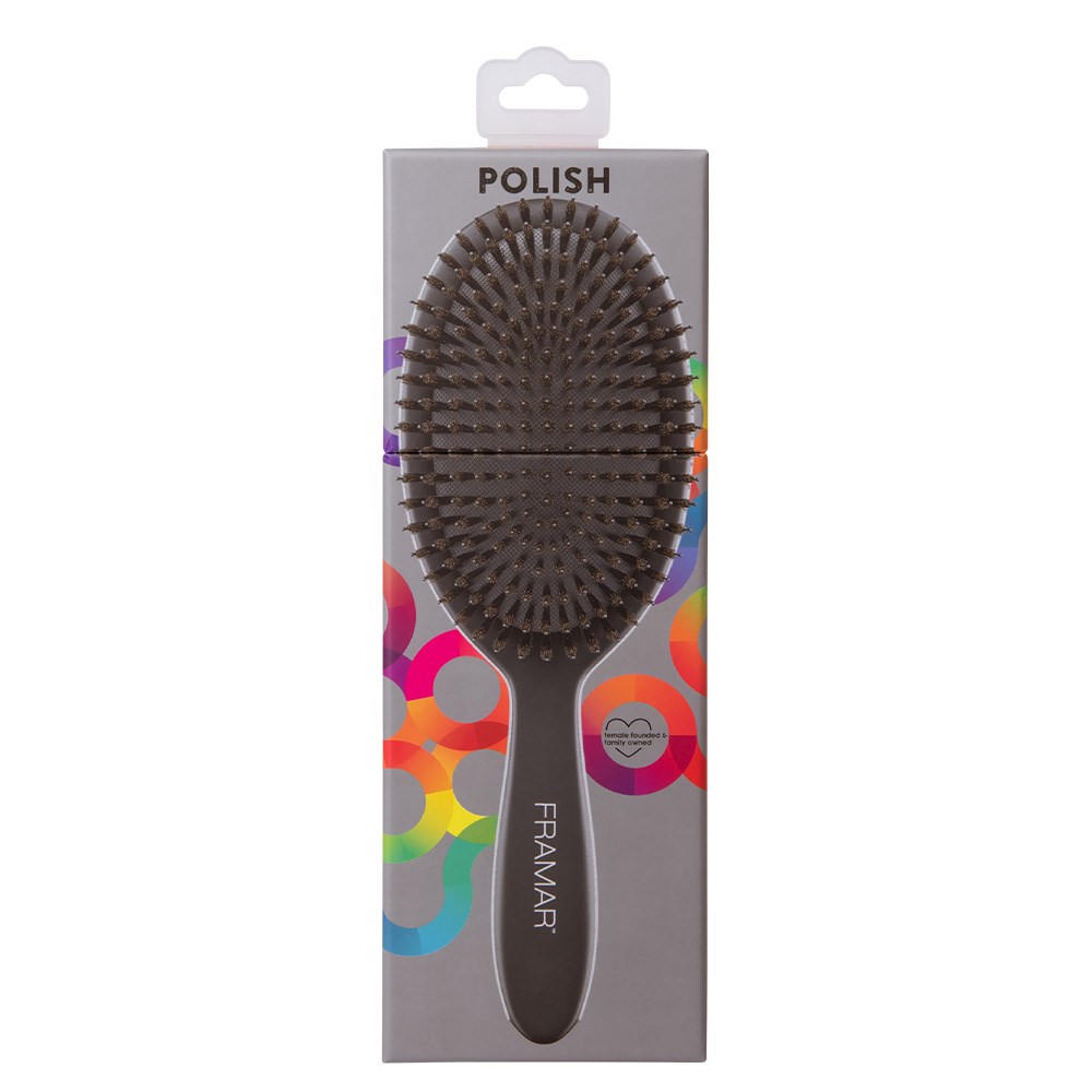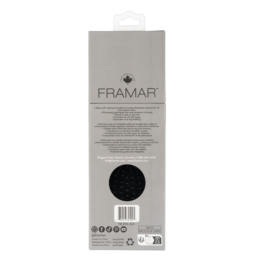 A polished twist on Framar’s Detangle Hair Brush. Framar Polish Hair Brush Black features boar bristles which work hard to style hair with ease. Designed to achieve the ultimate shiny finish on every polished look and slicked back style. Perfect for styling wet or dry hair. Ideal for all hair types, including wigs and extensions.