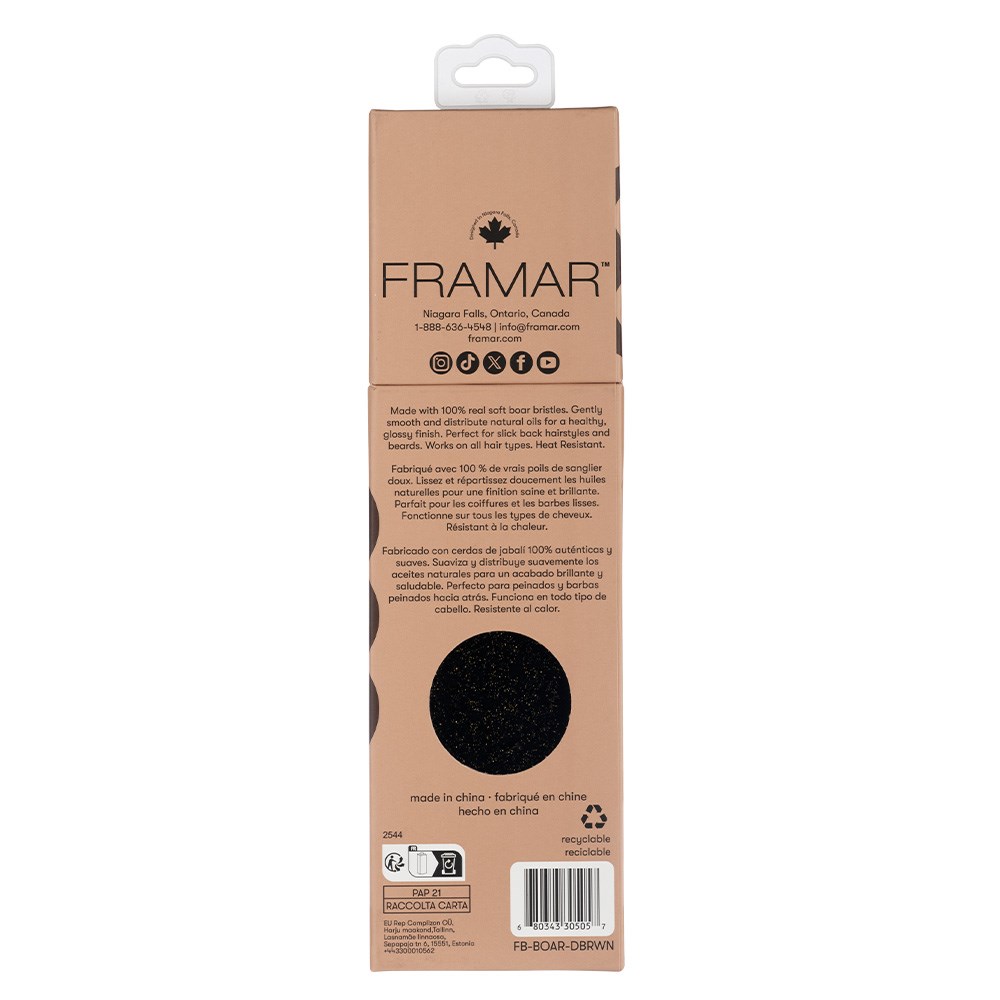 A salon-worthy essential designed to smooth, shine and strengthen. Framar Boar Hair Brush is crafted with care. This brush features 100% boar bristles which distribute hair’s own oils from root to tip, leaving hair silky, soft and smooth. Polished wood handle. Works beautifully on all hair types.