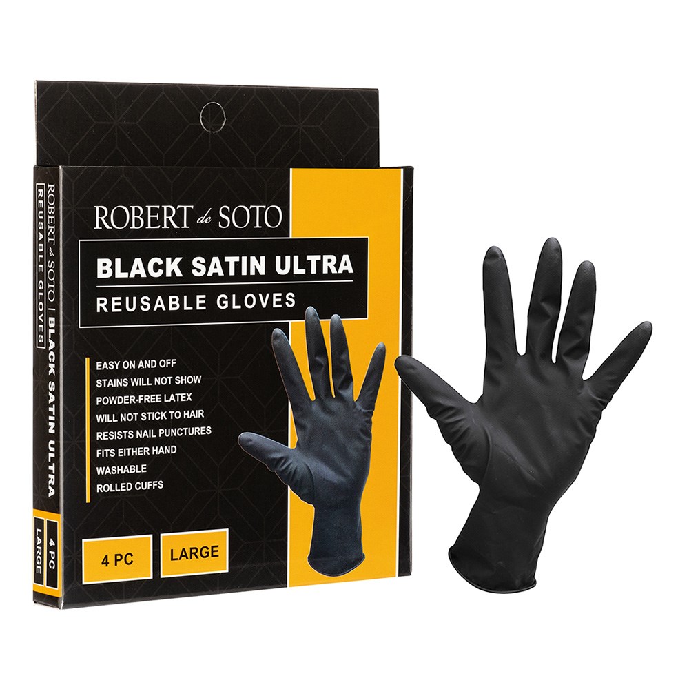Carefree and stain-free! Easy on and easy off, Robert de Soto Black Satin Reusable Gloves Large 4pc are made from powder-free natural latex to protect your hands from colour stains. These comfortable, reusable gloves won’t pull or stick to the hair, and are resistant to nail punctures. Designed to fit either hand, these washable gloves are available in a pack of 4. Size: Large.