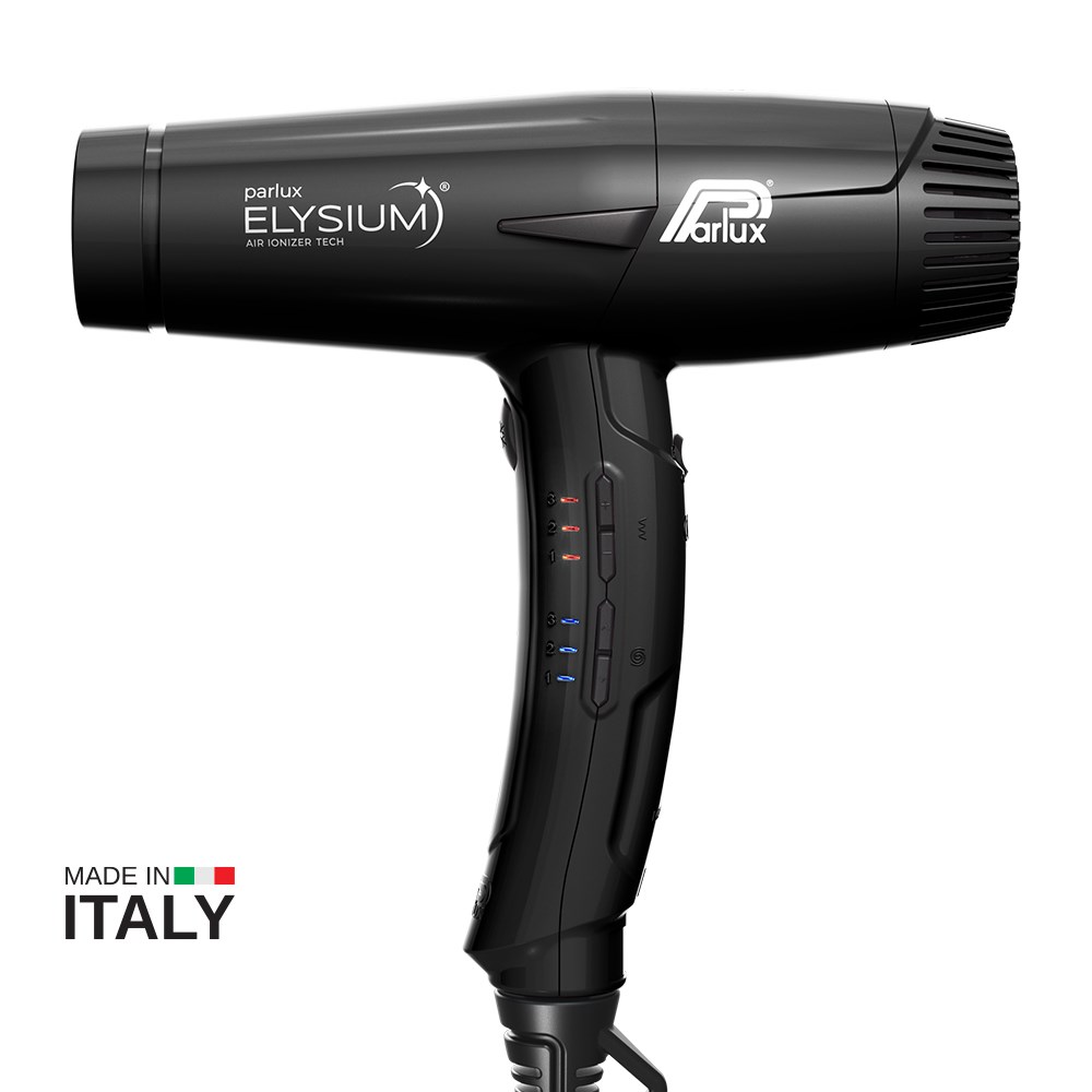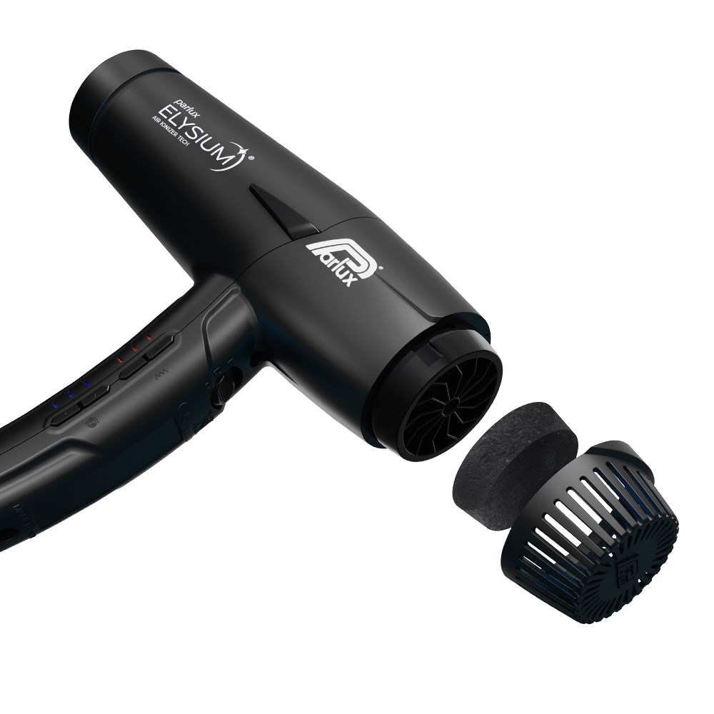 The first Parlux digital mini hair dryer. Futuristic for an unprecedented user experience. Maintaining the reliability which has distinguished Parlux for over 40 years, Parlux Elysium Hair Dryer Black is compact, light and powerful. Professional digital oversized mini-motor delivers a powerful 2,300 watts and 80m3/h airflow. 3 speed and 3 temperature settings for 9 combinations. Air Ionizer Tech ionic technology for smoother, sleeker results. Lightweight and perfectly balanced with an ergonomic handle. Quick and easy cleaning with washable and replaceable sponge filter. Includes 3 concentrator nozzles, 2 of which are new AirFusion nozzles to optimise airflow for faster, more precise styling with added shine. Made in Italy.