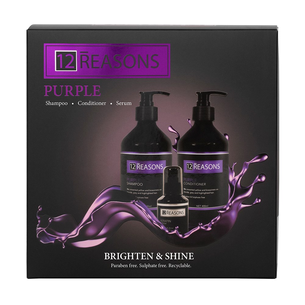 This is the perfect gift for dull blonde, grey and highlighted hair. Eliminate unwanted yellow and brassy tones with 12Reasons Purple Shampoo and Conditioner, while boosting essential hydration and nourishment. Partnered with 12Reasons Keratin Hair Serum to infuse brilliant shine and prevent frizz. Designed and formulated in Australia, this brighten and shine set contains full-size products at a great price, making it a wonderful gift for yourself or a loved one. Vegan, cruelty-free, sulphate-free and paraben-free.