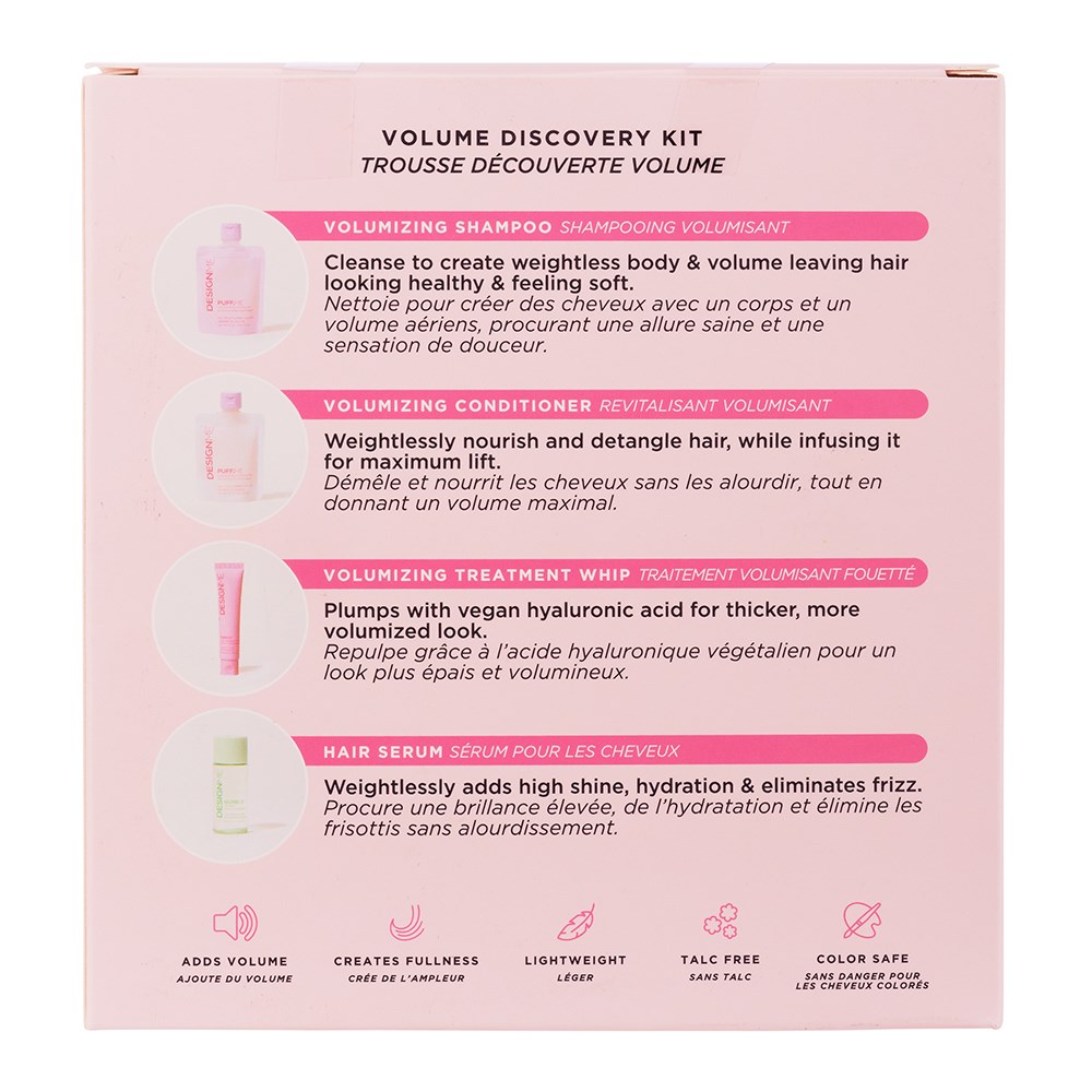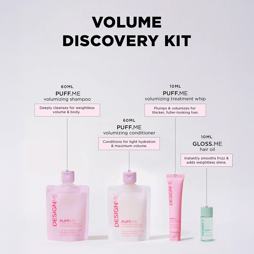 A limited edition kit, perfect for trying (and falling in love with!) a stylist-approved routine for smooth, voluminous hair. DESIGNME Discovery Kit Volume includes Puff.ME Volumising Shampoo, Conditioner, Volumising Treatment Whip and Gloss.ME Hair Serum. Plump strands, boost body and enjoy silky, weightless shine. Excellent for fine, thin and flat hair. Free from SLS, SLES and parabens. 100% vegan and cruelty-free.