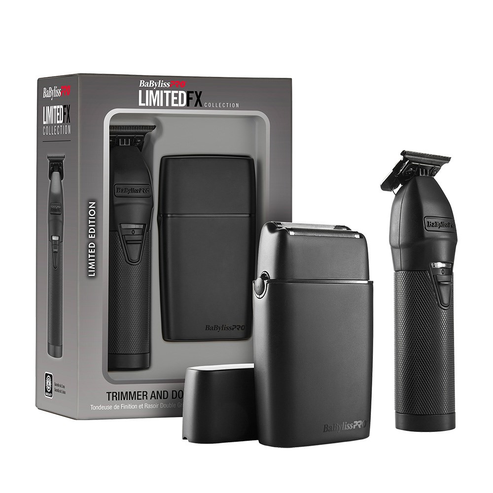 Two times the power, precision and performance. BaBylissPRO LimitedFX BlackFX Trimmer and Shaver Duo is limited edition in matte black. BaBylissPRO LimitedFX BlackFX Trimmer is powered by a longer-life N1 brushless motor. 7,200 rpm for a faster moving blade. Black graphite deep tooth T-blade and zero gap adjustable for powerful precision. High performance lithium-ion battery for up to four hours cordless runtime. USB-C charging. BaByliss PRO LimitedFX BlackFX Shaver’s hypoallergenic black titanium double-foil system with dual counter-cutting blades delivers a superb shave. 9,500 rpm high speed motor. Up to three hours of cordless runtime for on-the-go convenience. Both tools feature all-metal housing in limited edition matte black.