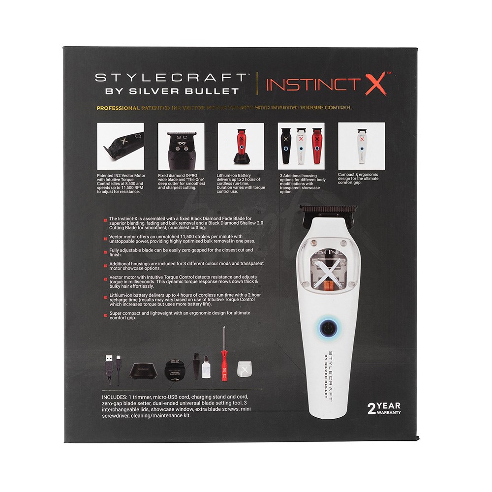This is the power of intuition. StyleCraft by Silver Bullet Instinct X Hair Trimmer is a super-powerful vector motor trimmer with intuitive torque control. Enjoy extreme power with an ergonomically designed, compact and customisable body. With intuitive torque control, the Instinct X detects resistance and adjusts torque in milliseconds. Dynamic torque response effortlessly achieves any style with precise ease. Patented IN2 vector motor idles at 8,500 rpm and speeds up to 11,500 rpm. Fixed Black Diamond Carbon DLC X-PRO wide blade and The One deep cutter for smoothest, sharpest cutting. Lithium-ion battery with up to two hours of cordless runtime. Three additional housing options for different body modifications with transparent showcase option.
