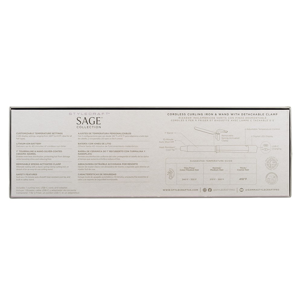 Love versatility? Love StyleCraft by Silver Bullet Sage Cordless Curling Iron with Detachable Clamp. A removable spring-activated clamp lets you style with a classic spring-clamp curling iron or detach for an easy-to-use curling wand. Incredible styling flexibility so you can create classic curls or natural-looking waves as you desire. Customisable temperature settings from 170°C to 210°C, catering to every hair type. In sage green, full-sized 25mm tourmaline and nano-silver coated barrel enables consistent heat distribution, protecting hair from damage while enhancing shine and reducing frizz. Lithium-ion battery delivers up to 40 minutes cordless runtime. Portable, travel-ready and USB rechargeable.