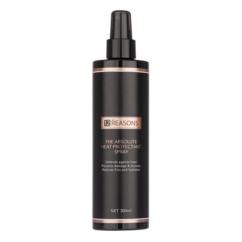 This is 12Reasons The Absolute Heat Protectant Spray. Supercharge your heat defence with 12Reasons. Infused with castor oil, hydrolysed collagen, hydrolysed keratin and coconut oil, this heat protectant is designed to protect against damage, dryness and frizz with transformational ingredients. Pump bottle delivers an ultra-fine mist so you’ll never apply too much. Use on wet or dry hair to protect hair from heat styling while infusing a fresh, uplifting fragrance. Generous 300ml size lasts style after style.