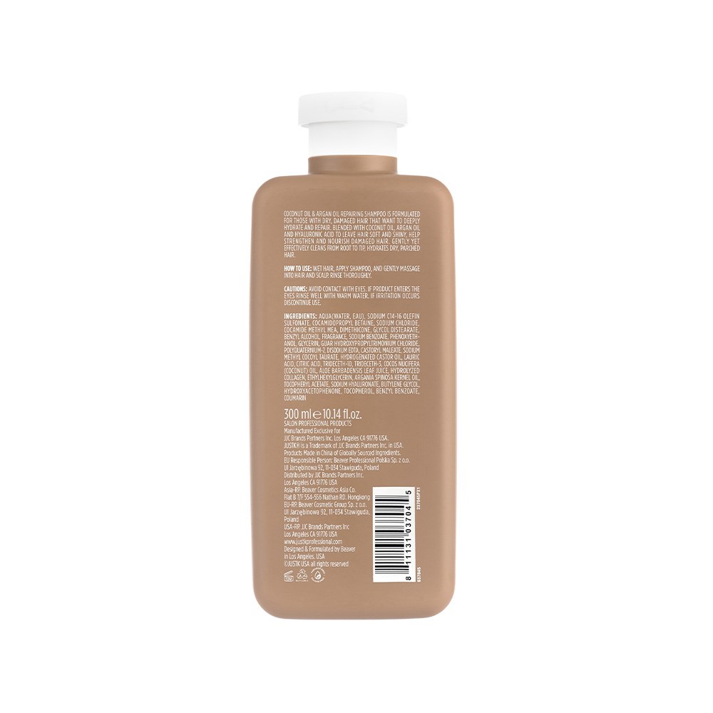JustK is just results. From whoa to wow, one wash at a time. Salon-proven formulas which solve all the problems of the hair rainbow. Choose JustK Repairing Shampoo for deep hydration and repair. Infused with coconut oil, argan oil and hyaluronic acid, this sulphate-free, paraben-free shampoo strengthens and nourishes dry, damaged hair. Gently cleanse from root to tip while hydrating parched strands. Beautiful strength becomes affordable!